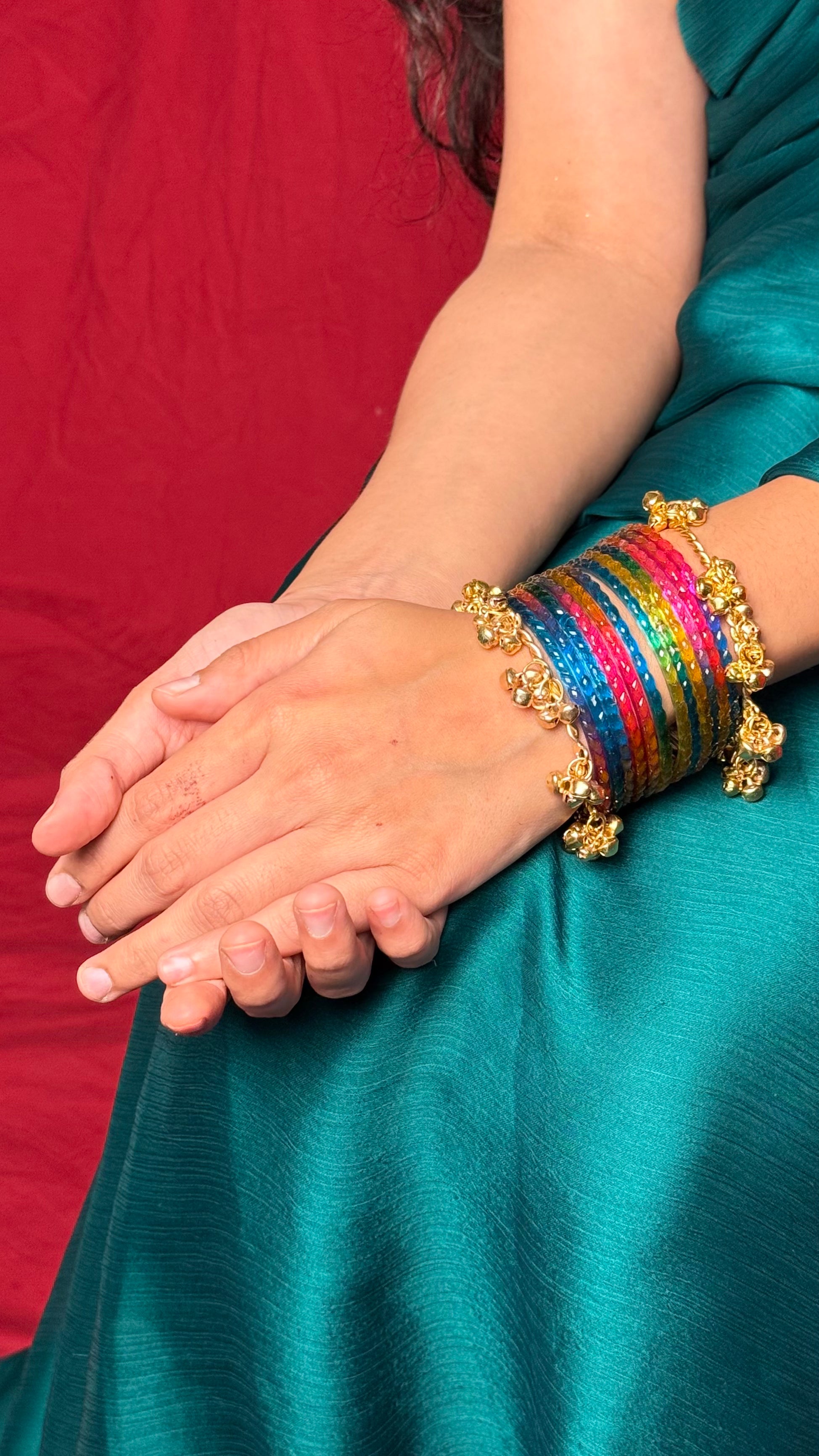 This stack includes a dozen of our rangon ki jhilmil stone studded Bangles - along with our sunehri ghunghroo choodiyan