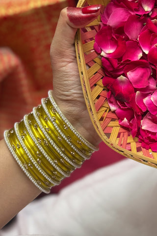 The Sunehri Moti Stack | Yellow Stone Studded Bangles with Pearl Bangles