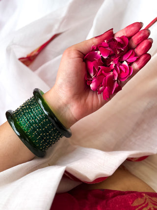 The Barsati Moti Stack | Dark Green Stone Studded Bangles with Pearl Bangles