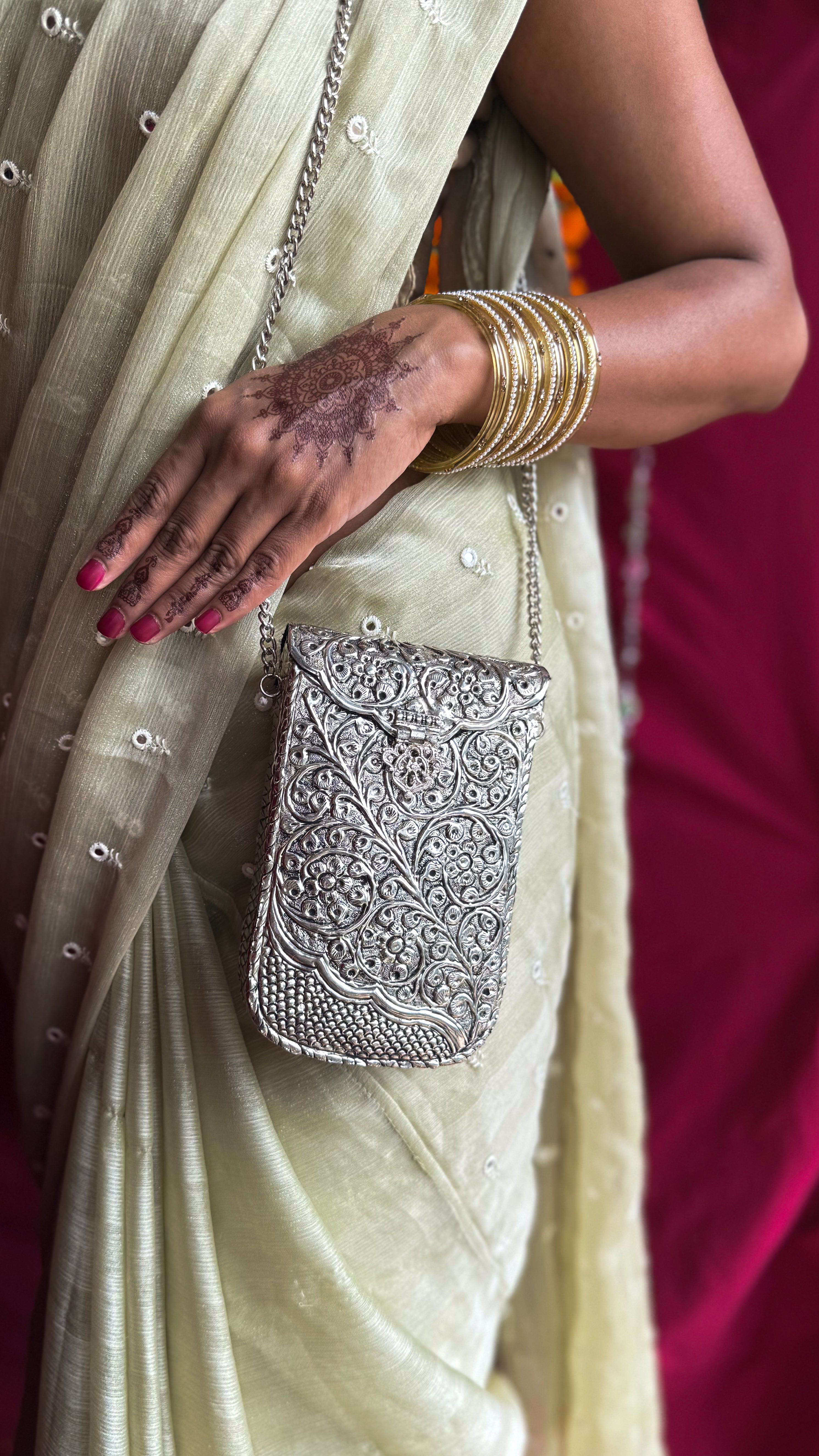 A tiny treasure that holds your essentials, this embossed pouch blooms with delicate metal work. Playful, intimate, and heritage-inspired, it’s a little collectible you carry with joy wherever you go. Crafted with care, each element shimmers against the soft golden base, evoking the charm of a miniature garden.