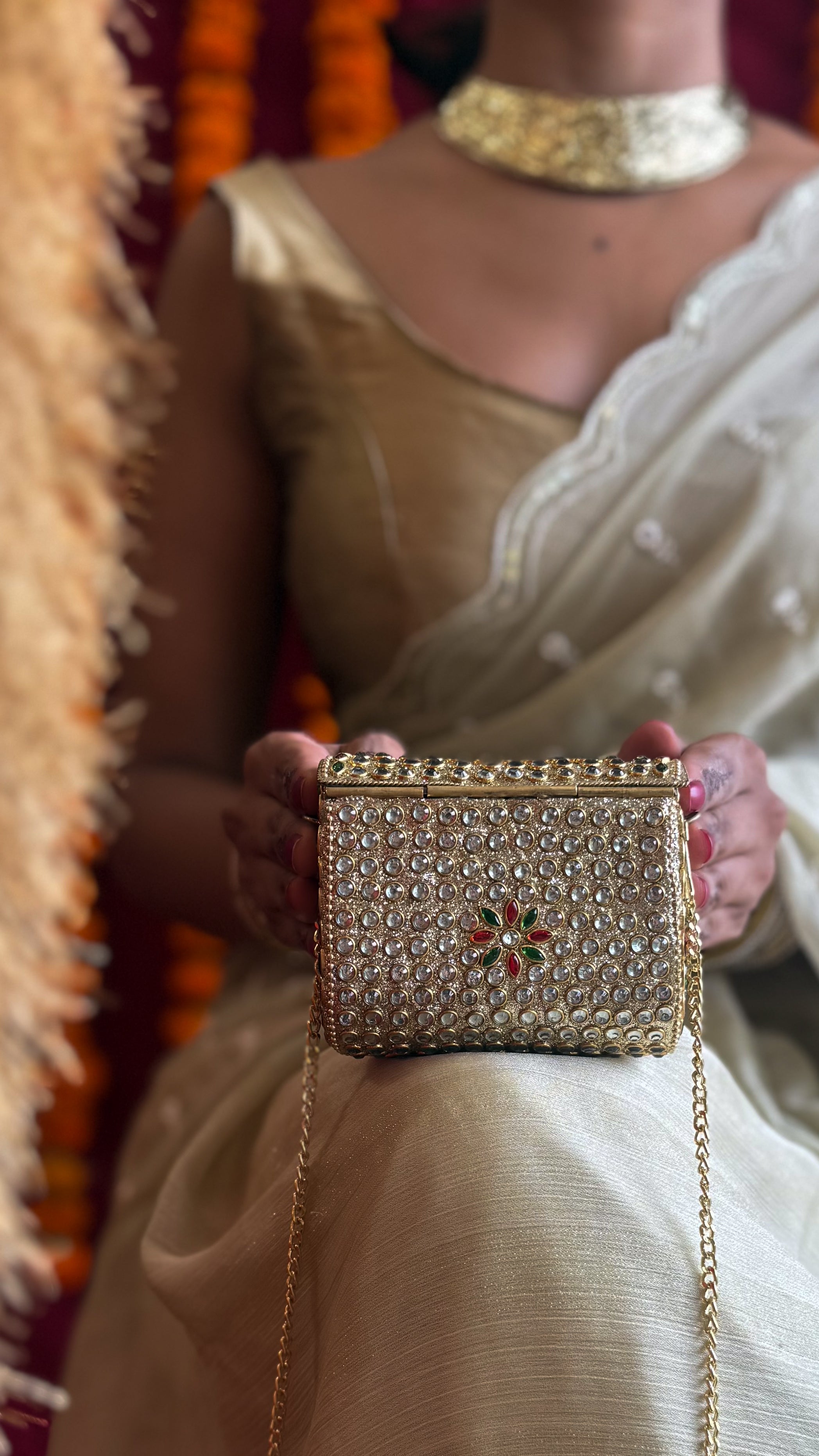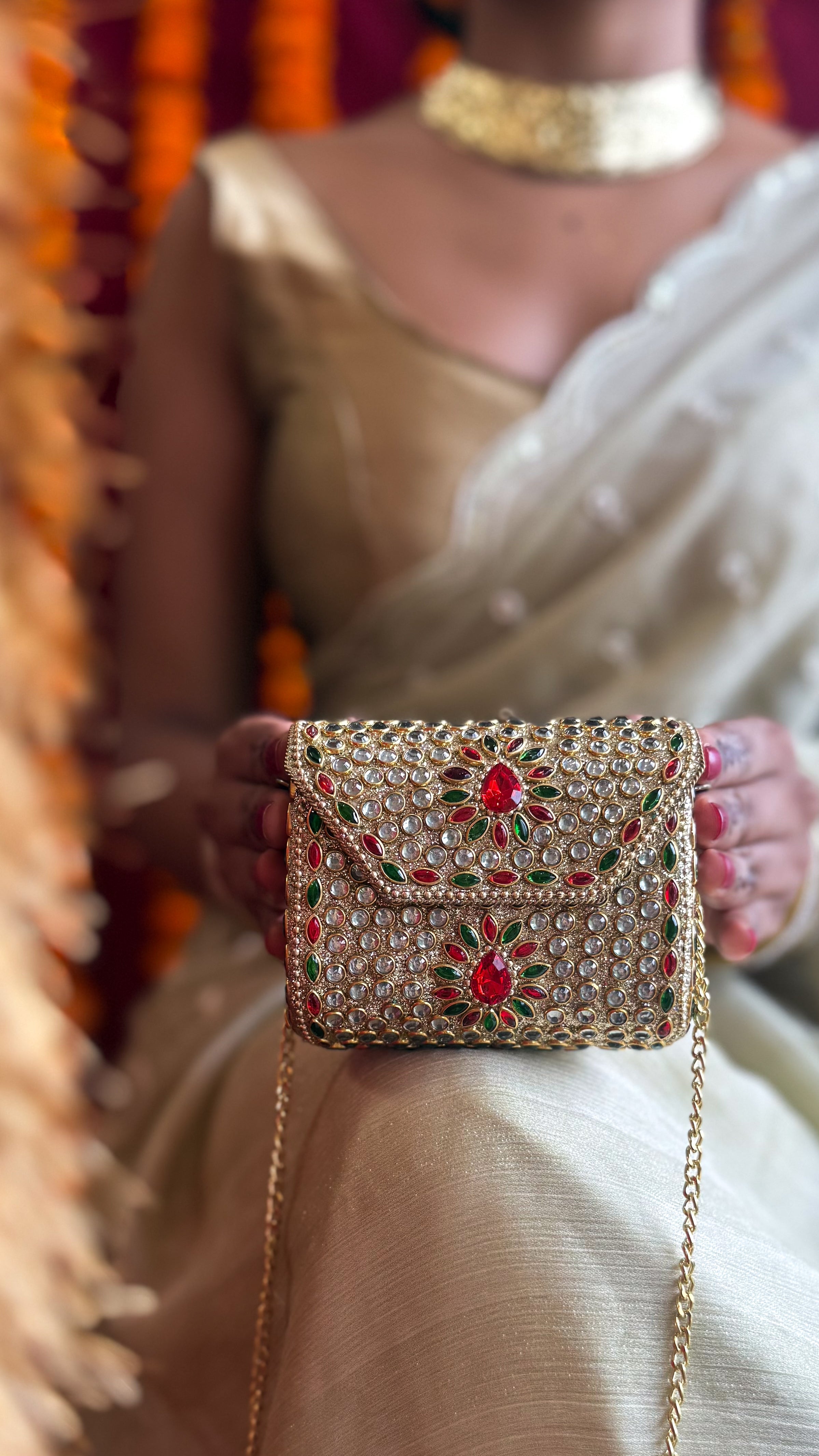 A celebration of light and craft, this Aaina Clutch catches every glance with its intricate reflective patterns. Handcrafted with care, each tiny mirror dances with movement, framed by delicate detailing that speaks of timeless artistry. Compact yet striking, it’s a wearable treasure that adds sparkle and heritage charm to every ensemble.