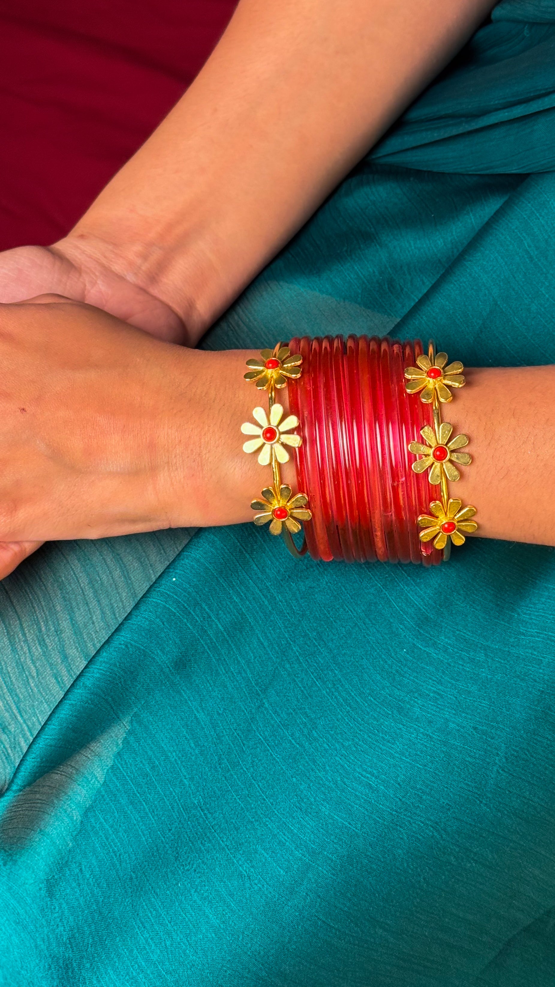 This stack includes a dozen of our deep pink Nazakat Bangles - along with our red Phoolmala Choodiyan