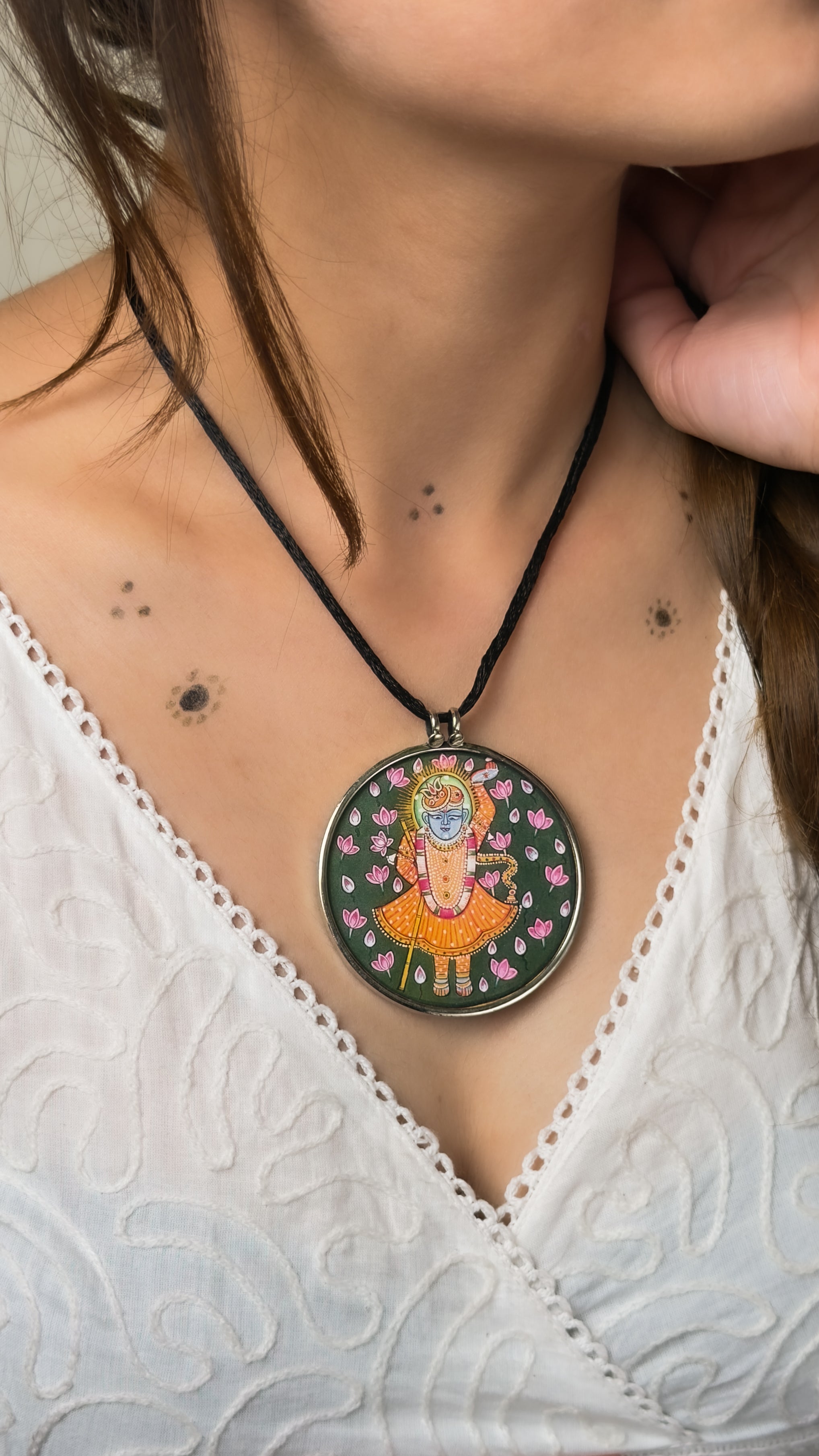 Inspired by the 400-year-old art of Pichwai from Nathdwara- a temple town in Rajasthan, devoted to Srinathji's temple. Each pendant carries motifs once painted to celebrate Shrinathji’s divine stories.