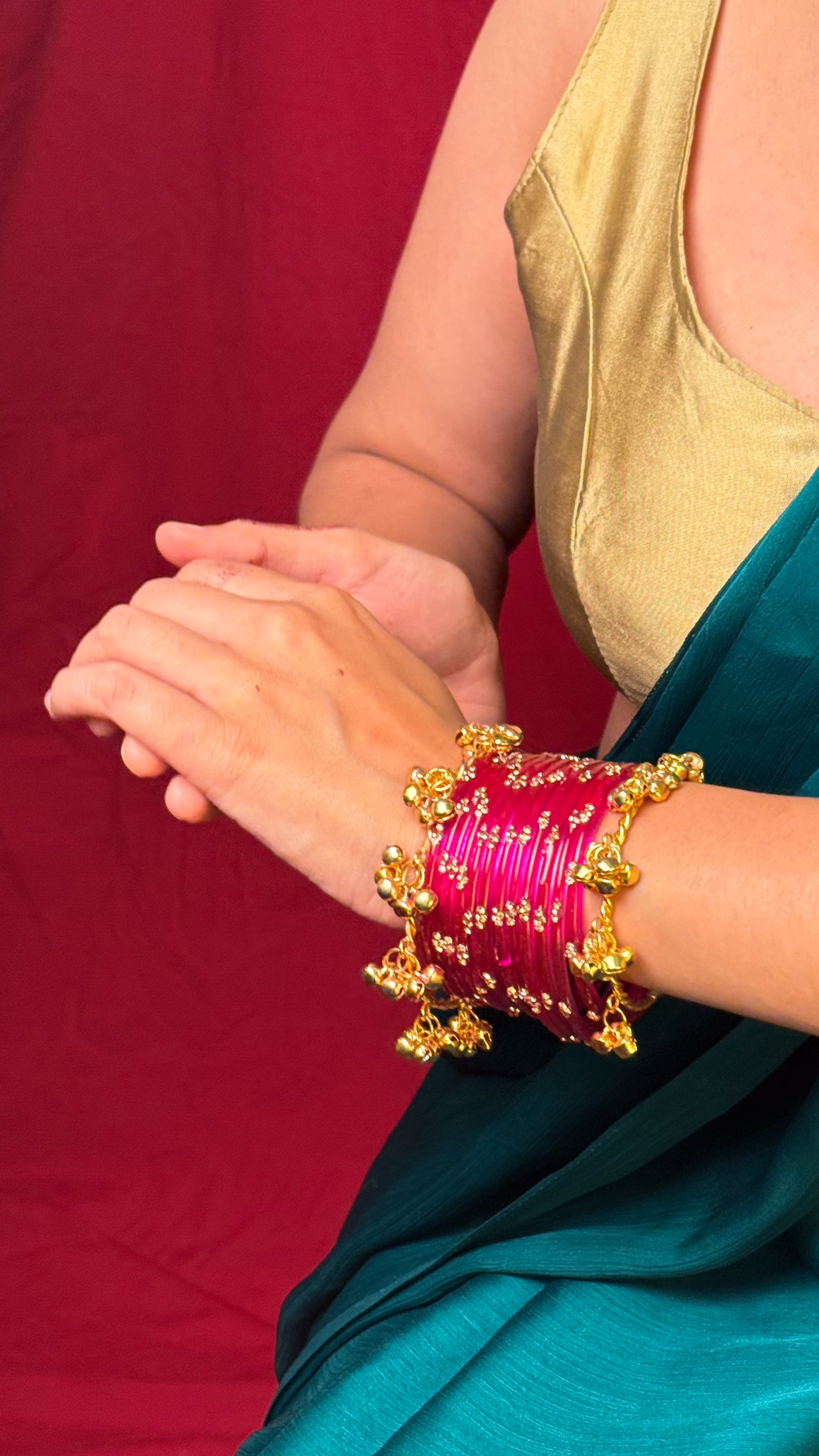 This stack includes a dozen of our deep pink stone studded Bangles - along with our sunehri ghunghroo choodiyan