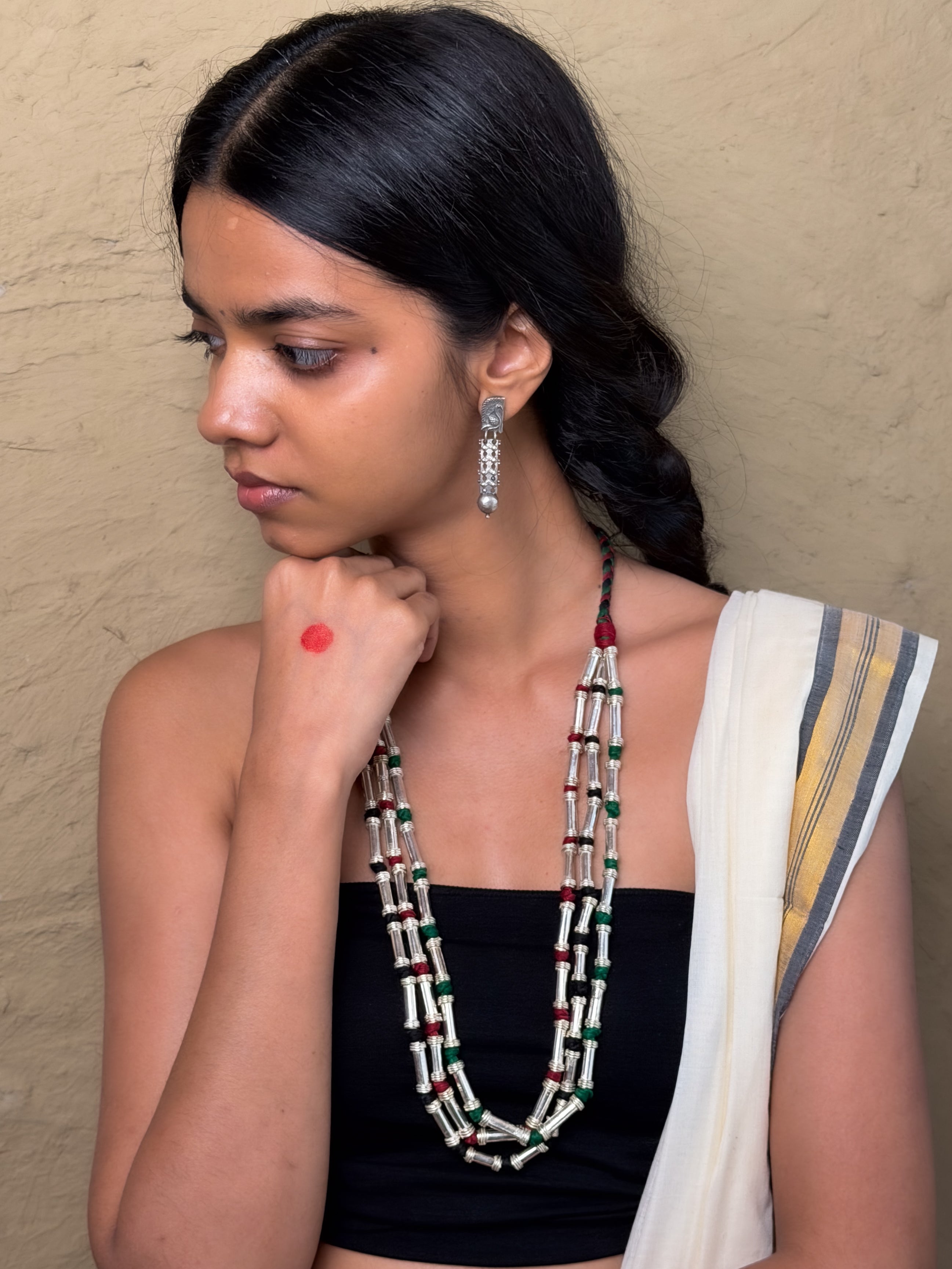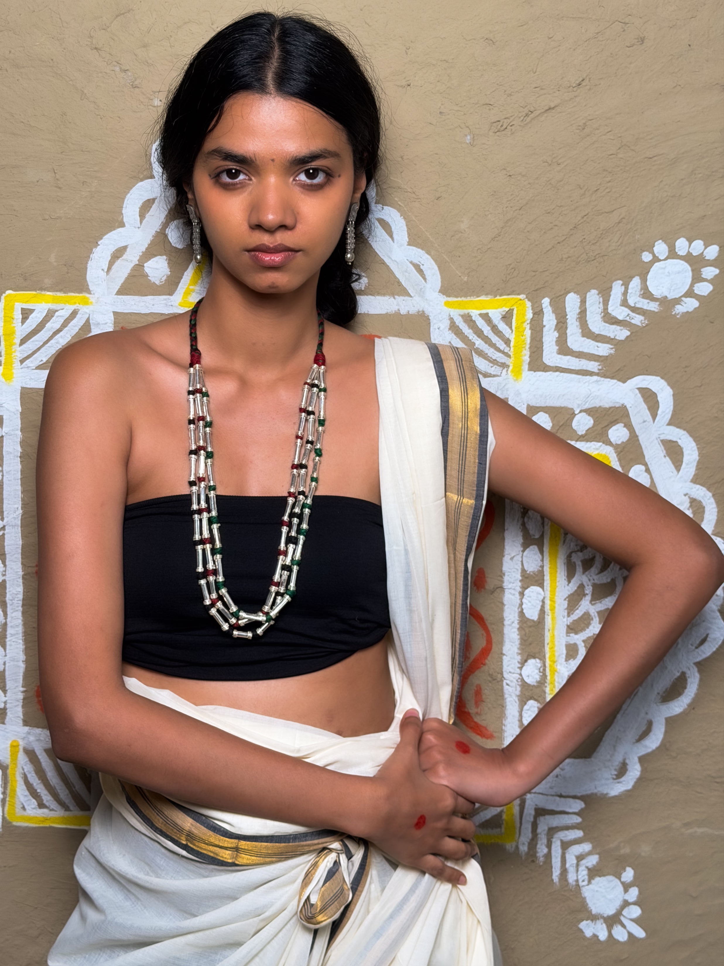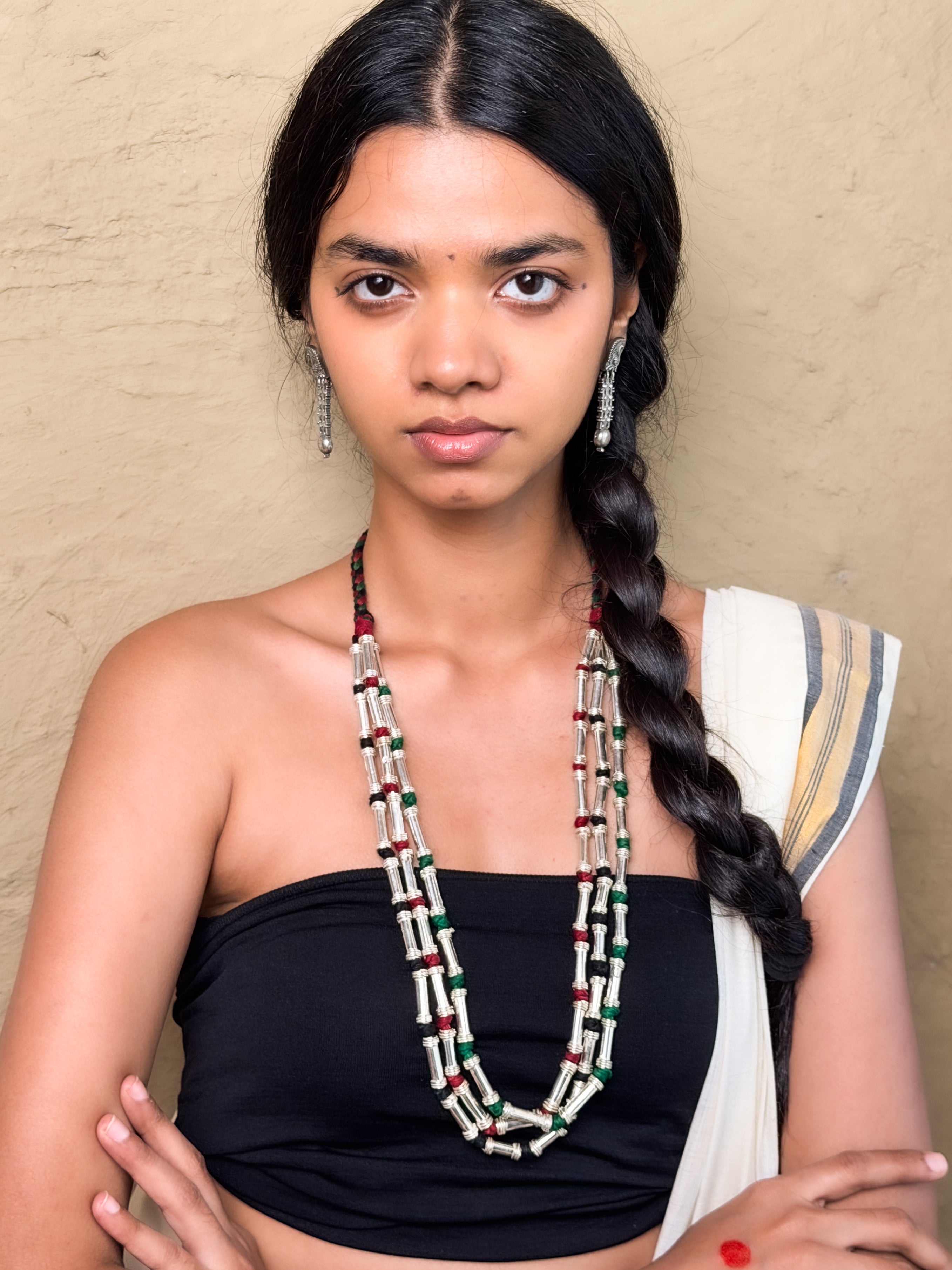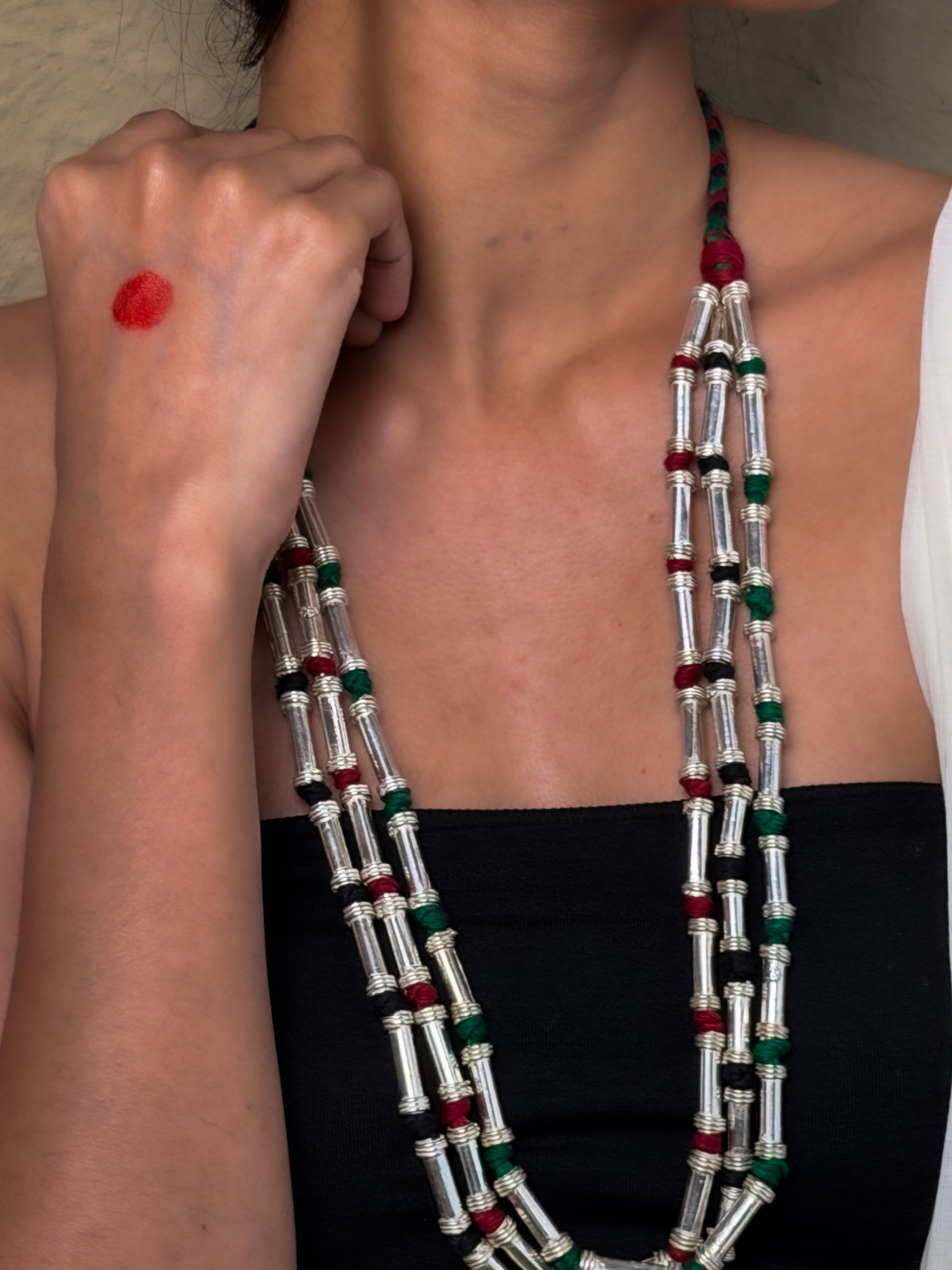 Infused with a hint of heritage, this statement necklace carries the rich cultural legacy of the Lambani tribe, the Banjara community from the Bijapur region of Karnataka. And this gives us a really close glimpse into their vibrant traditions and artistic finesse. This piece can be worn with anything traditional (sarees, suits, kurtas) and anything indo-western (skirts, shirts, tops).