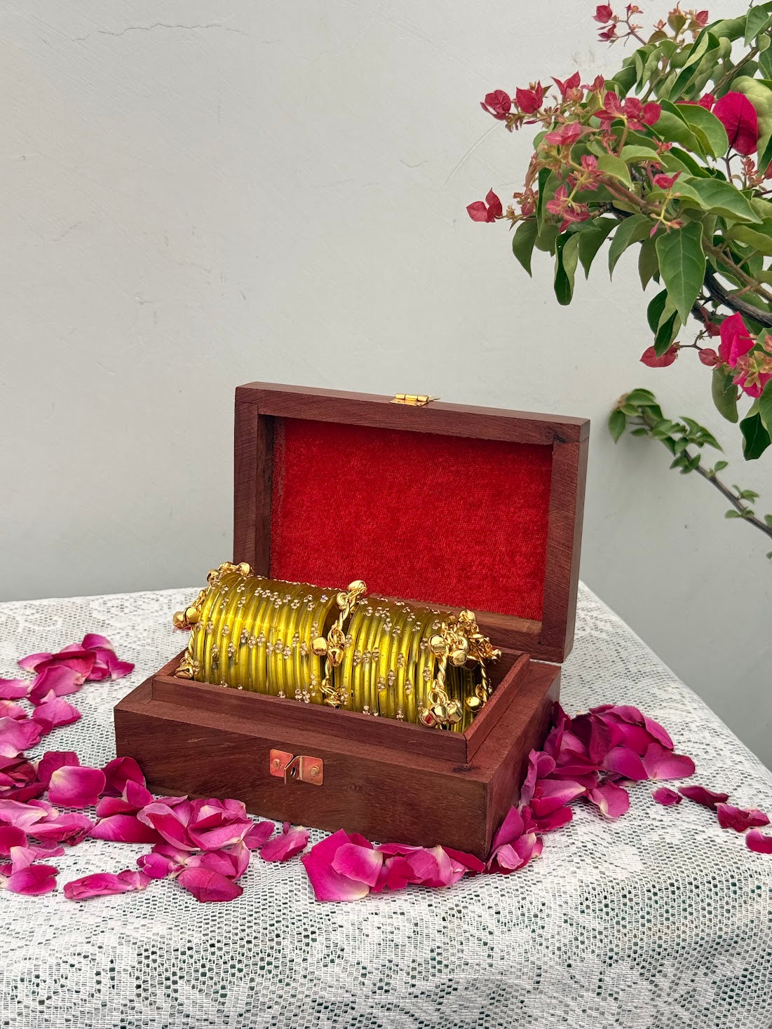 Inside: red fabric lining, a brass clasp, and enough room for a full set of bangles, your everyday jewellery, or whatever you reach for first in the morning.