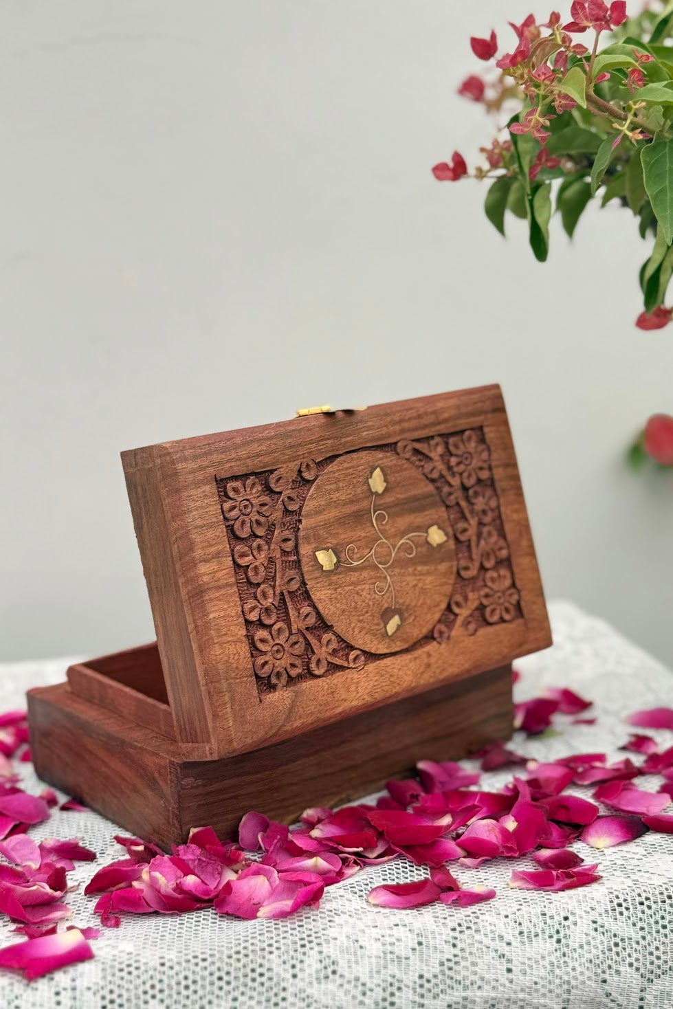 The lid tells the whole story. One half is deep relief carving — florals coiling into each other the way old embroidery does. The other half is bare wood with a brass inlay vine, light and trailing. Together they make something that doesn't look like anything else on your dresser.